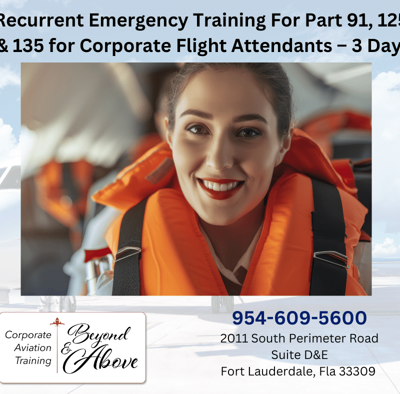 $3,500.00 – $3,800.00Price range: $3,500.00 through $3,800.00Corporate Flight Attendant Recurrent for Emergency Part 91, 125 & 135 – 3 day (In Class)